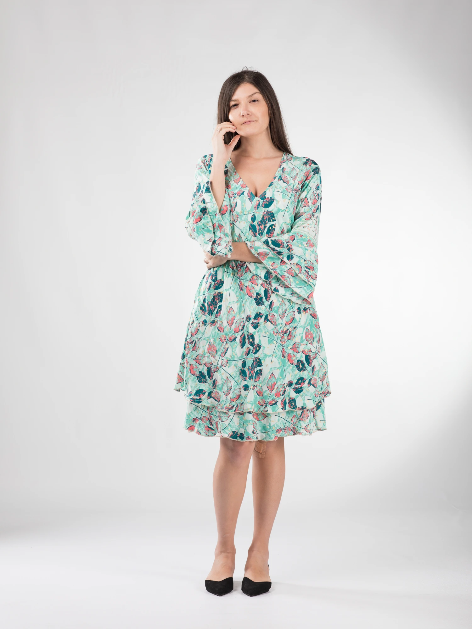 Rochie boho scurtă din material fluid cu mîneci 3/4 cu volane - Model 3