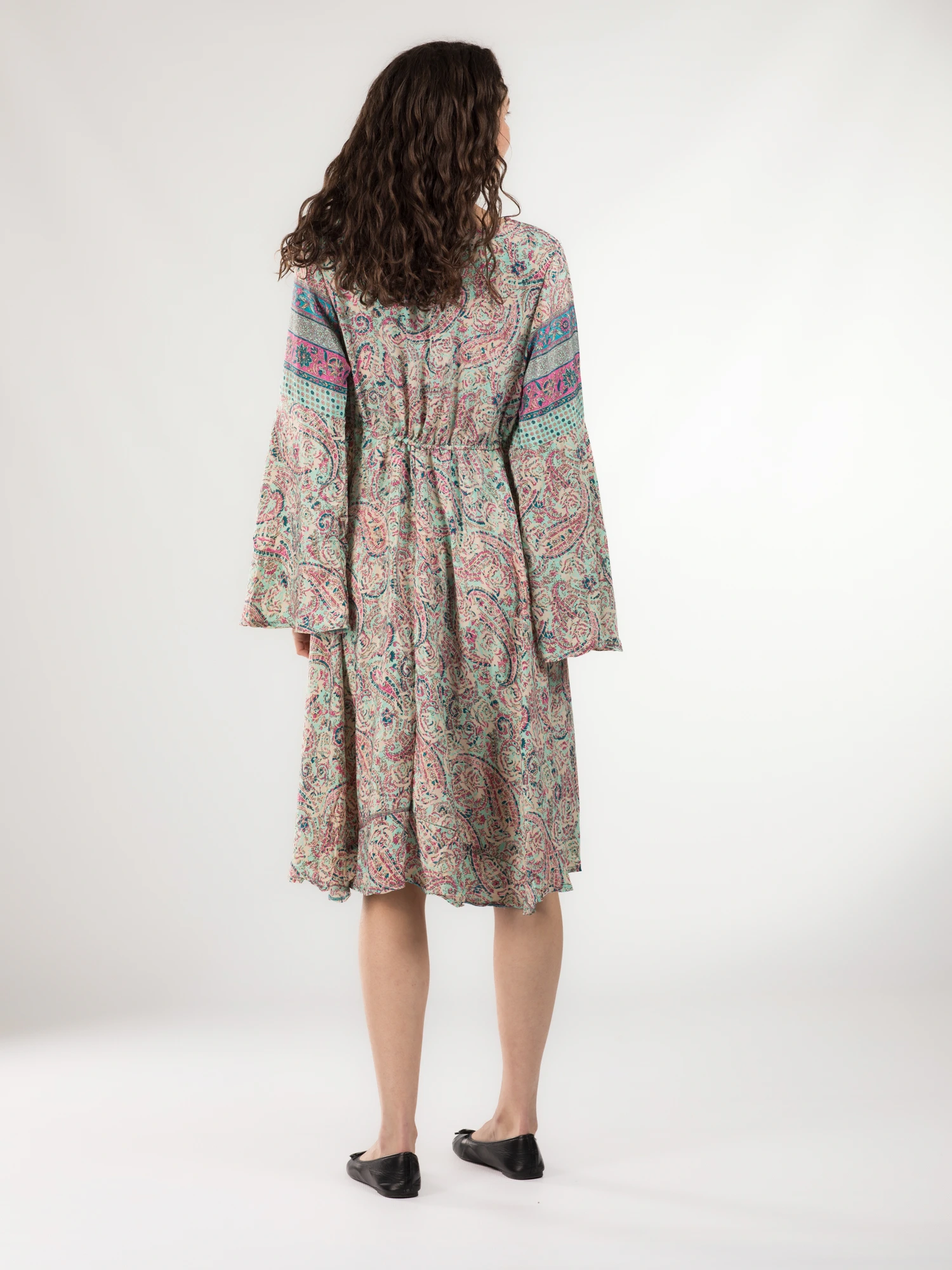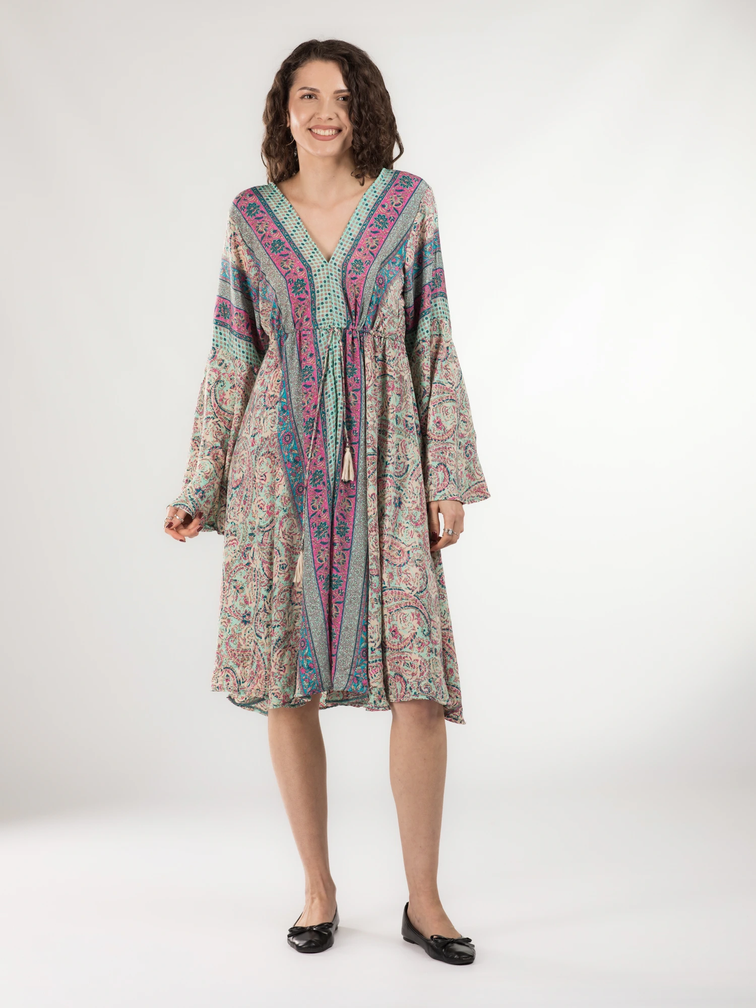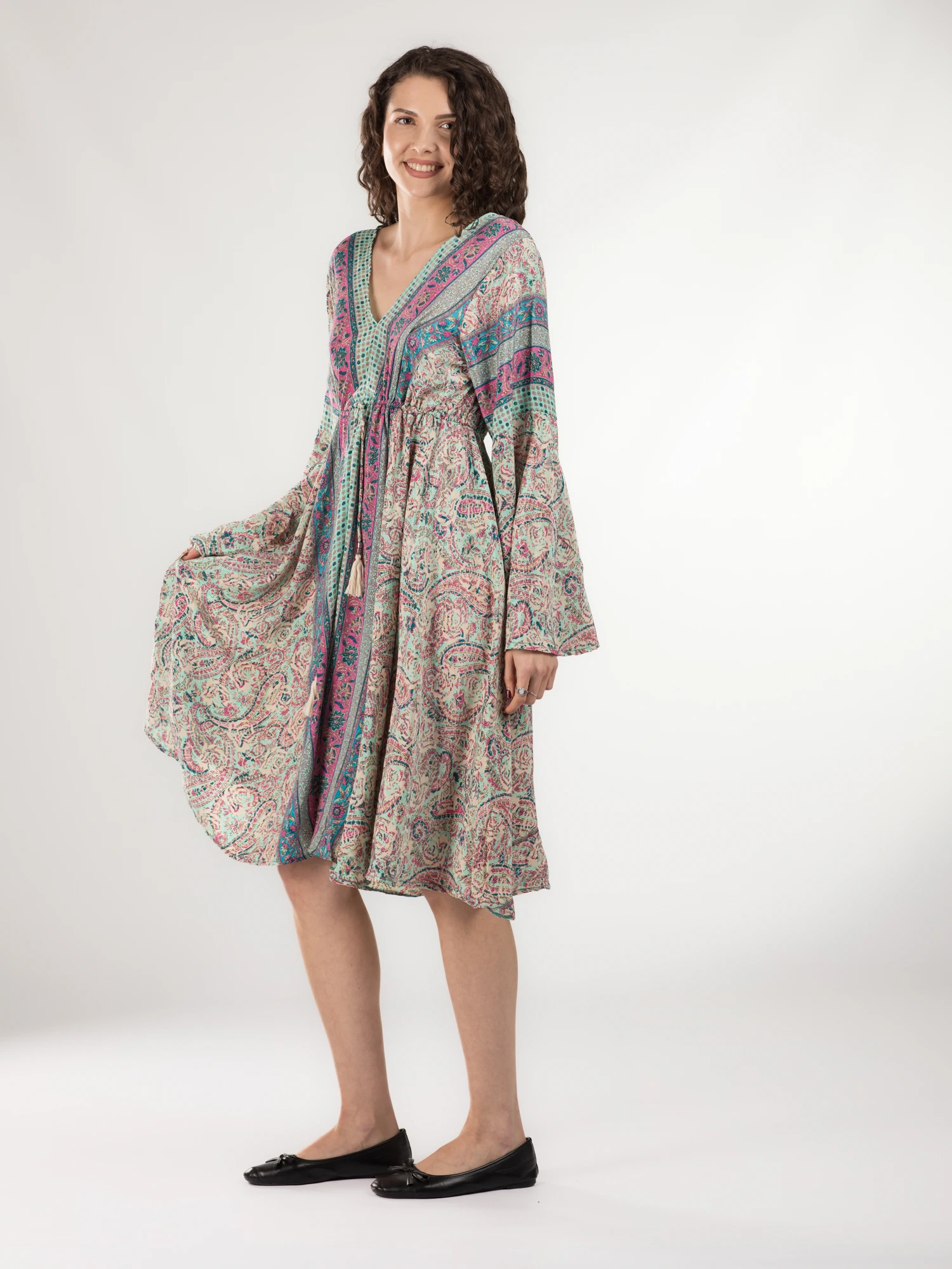 Rochie midi din material fluid cu șnur în talie și mânecă lungă - Model 19